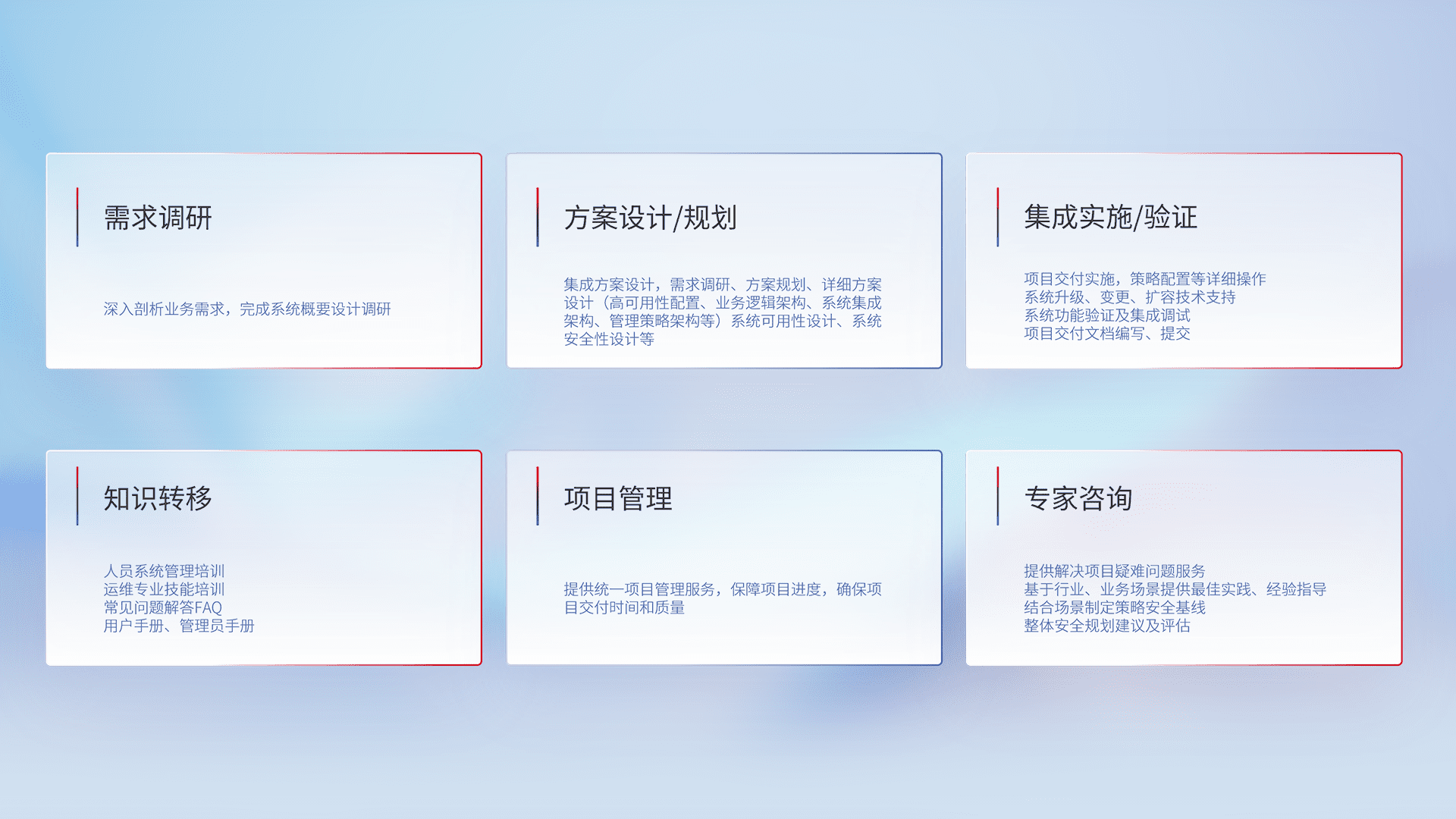 针对客户行业特性,,,将宏观的安全战略和需求,,通过专业的交付服务,,实现项目落地,,,为客户提供标准规范的集成交付服务。。。